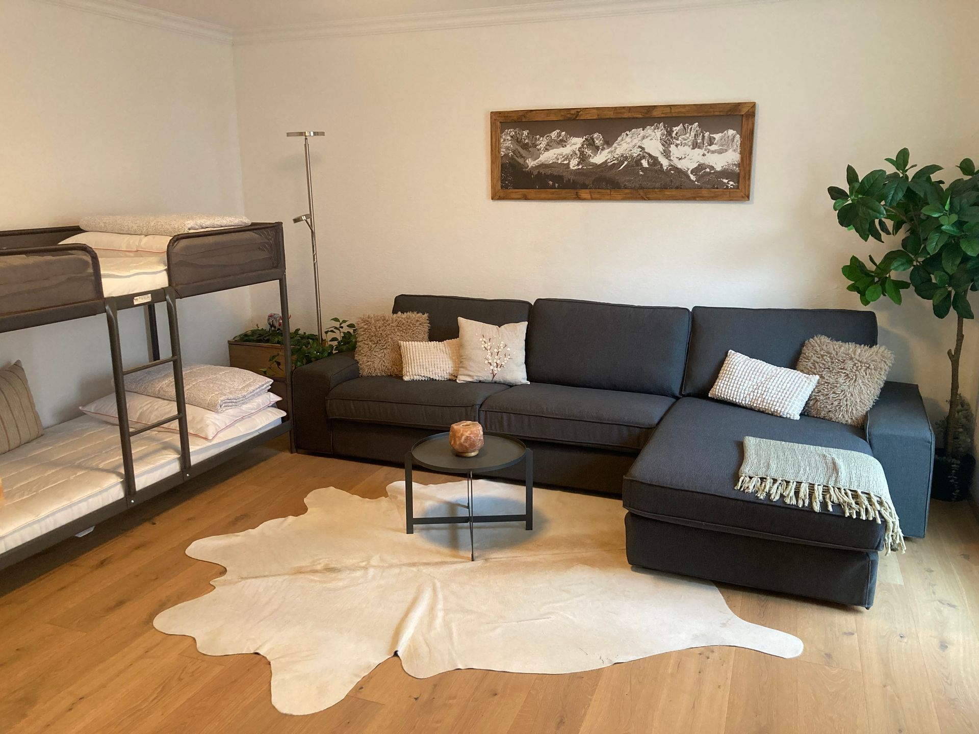 Die Einrichtung wurde ebenso bewusst gewählt: schlichte, hochwertige Möbel, gut abgestimmte Farben und ausreichend Platz, um zu entspannen. Hier treffen traditionelle Bauweise und moderne Wohnqualität aufeinander – und schaffen ein lebendiges, zeitloses Ambiente.